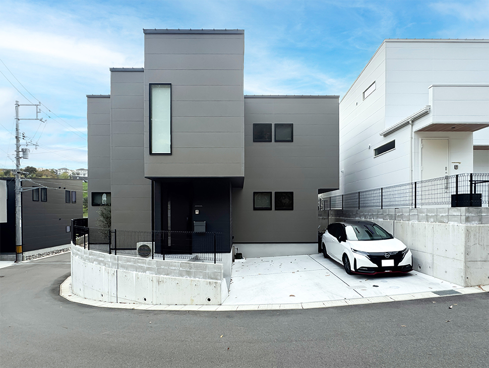 室内に入る日差しをコントロールする軒と袖壁のフレームが特徴で、大きな軒はポーチや軒下に自転車等も置きやすく、使い方が広がります。