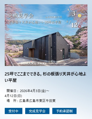 スマイクホームでは、4月3日(金)から4月12日(日)まで、広島市東区牛田にて完成見学会を開催いたします。