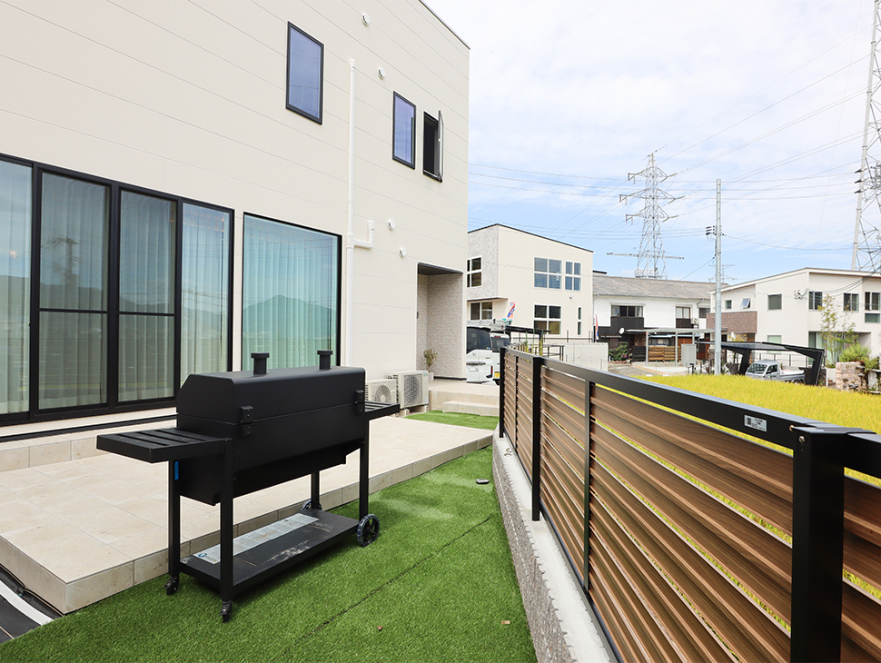 ダイニングの大開口からつながるのは、タイル貼りのデッキ。 食事や遊びのシーンを自然と外へ広げ、室内とアウトドアをシームレスにつなぐ心地よい居場所となっています。
