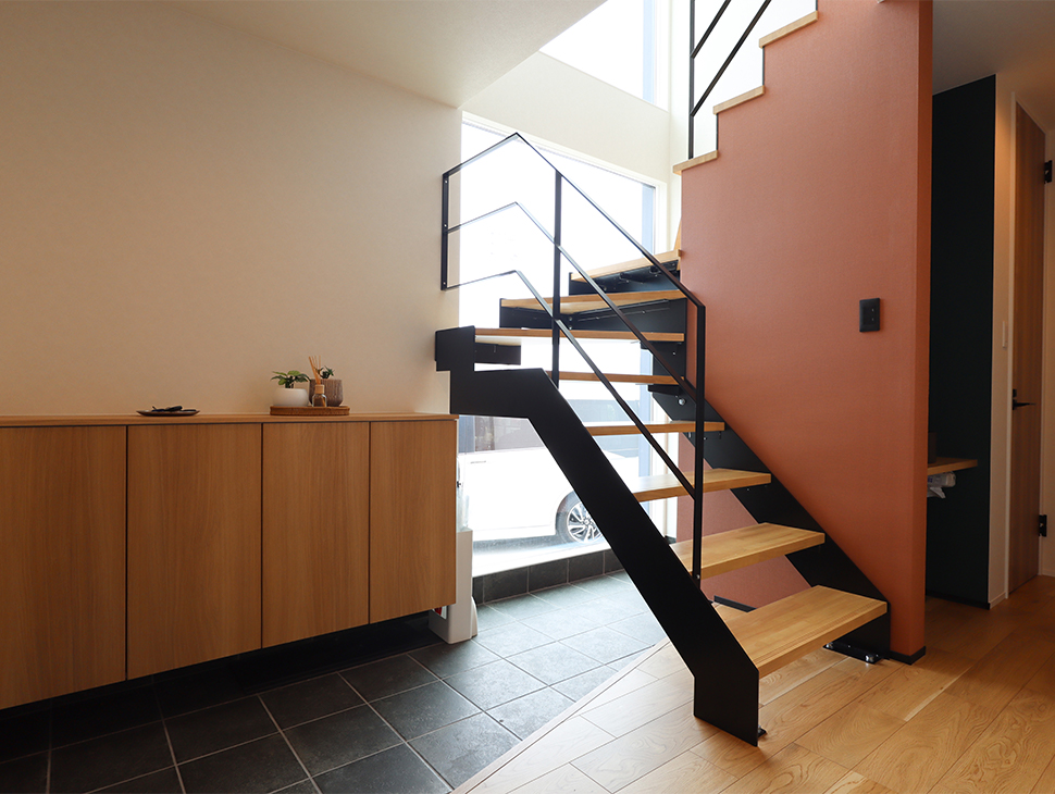 玄関の扉を開けると、まず目に飛び込むのはアイアン手すりのスケルトン階段。 奥行きを感じさせる土間空間には、橙色のアクセントクロスを取り入れ、明るく温かみのある迎え入れの空間を演出しています。